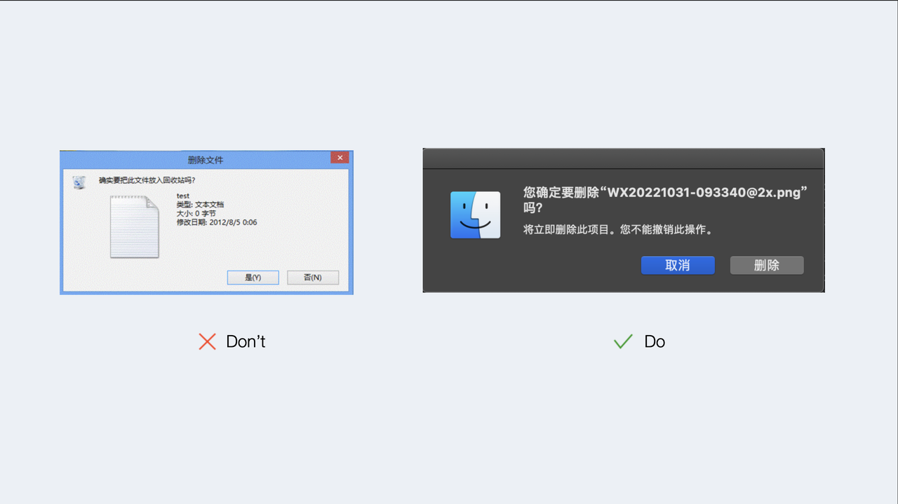 示例:Windows系统在早期的时候,删除文件时会让用户进行二次确认,但这是完全没必要的,因为删除文件不是真正的删除,还会在回收站里面。