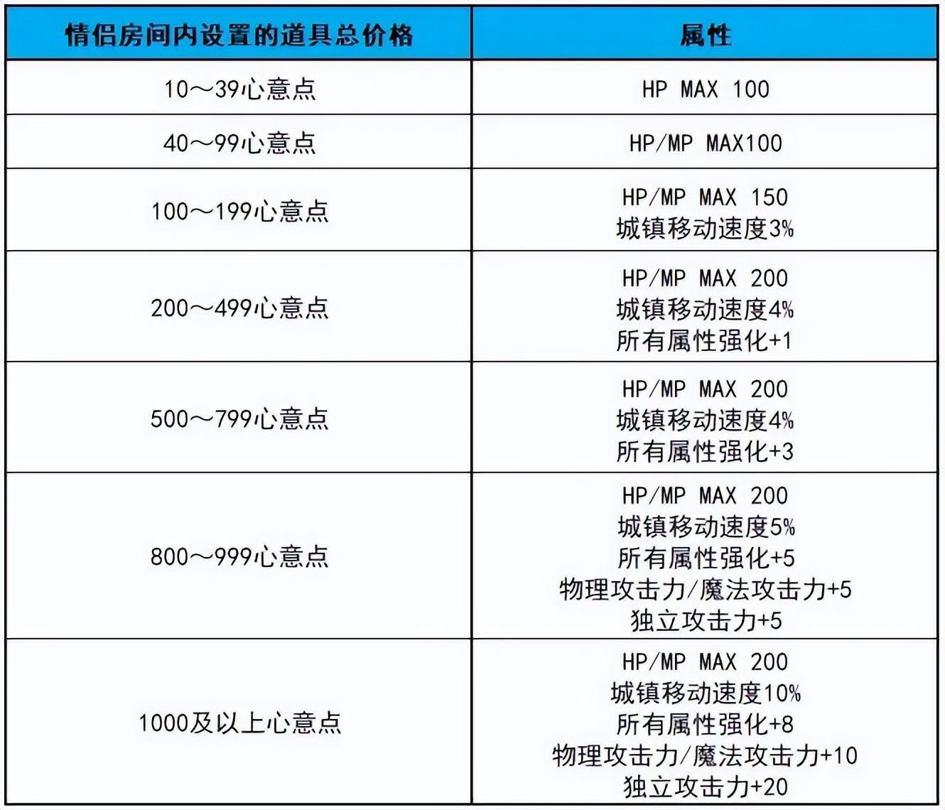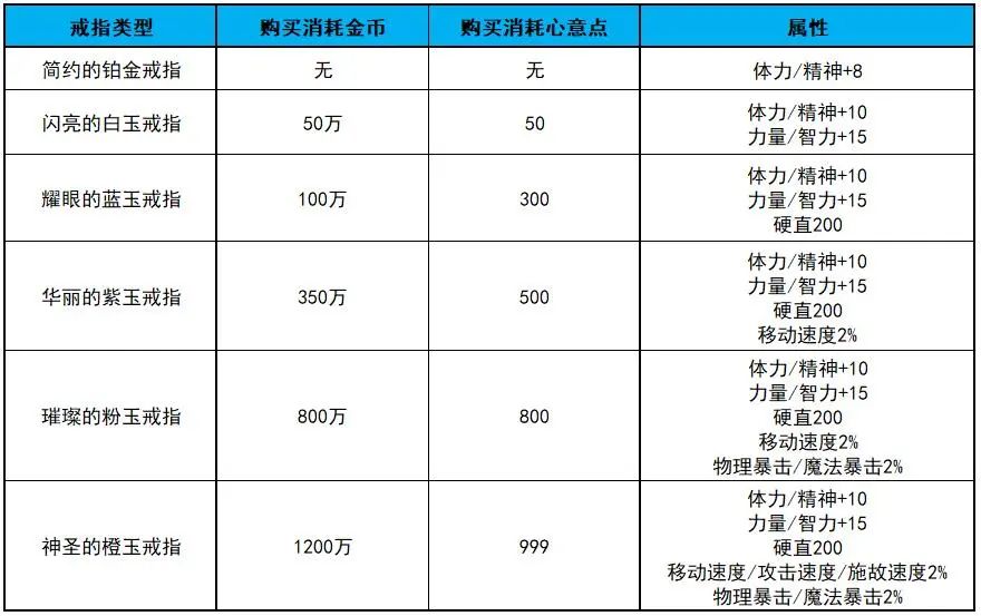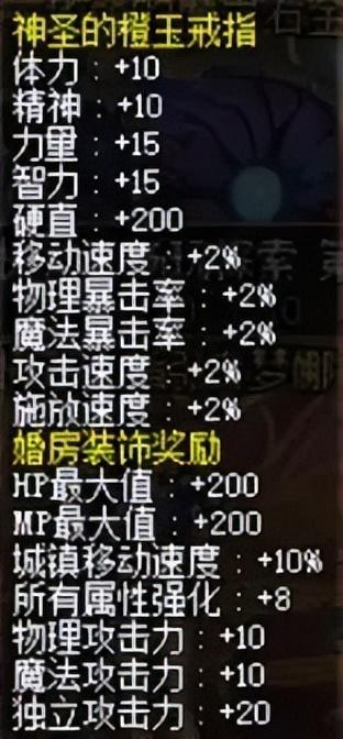婚戒与婚房具体的属性提升,可以参考下面这个统计表,可以看到我们应当优先升满级 婚房 与 闪亮的白玉戒指 ,即可获得最实用的几项加成。