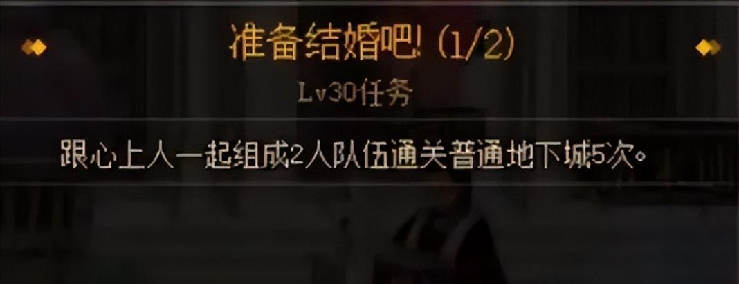 双方在大司祭处领取任务[准备结婚吧!1/2],要求组队通关5次普通地下城,可以顺带做每日。