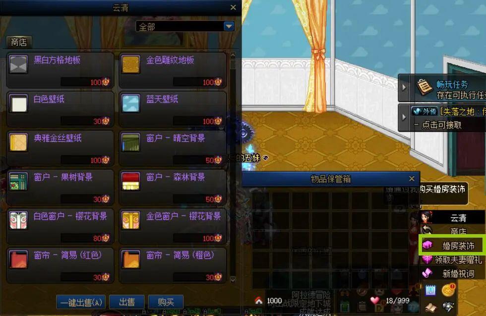心意点可购买婚房中的各类装扮,需注意同一品类尽量不要重复购买,1个地板、1个壁纸、1个窗户这样购买。