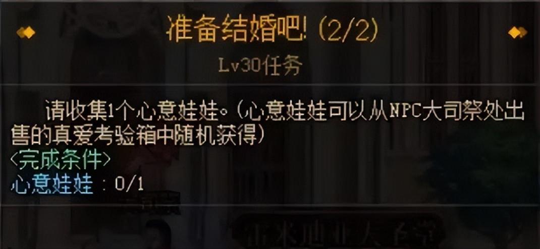 完成任务后继续领取任务[准备结婚吧!2/2],要求收集1个心意娃娃。