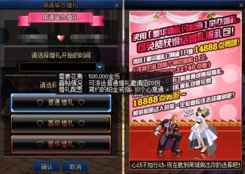 选择婚礼类型,待对方角色同意后即可开始婚礼,一般选择普通婚礼或高级婚礼即可。