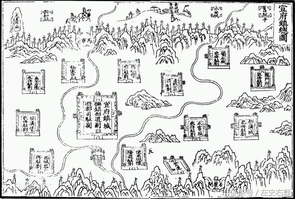 一、宣府镇。 宣府镇驻地在宣府卫(今河北张家口市宣化区),宣化也有“京西第一府”之誉。(《射雕英雄传》中的郭靖与黄蓉即在此初相遇)。宣府镇为北京城的西北门户,离北京也仅有170公里,向来是蒙古部落进京朝贡的入关通道。若宣府镇一失,蒙古部落的骑兵将可以直接南下华北平原。