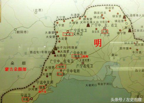 四、辽东镇。 辽东镇驻地原在今辽宁省辽阳市,后迁今辽宁省锦州市的北镇市(广宁)。不但是大明在东北地区的政治中心、军事重镇,也是东北地区的经济、文化中心。明初为辽王朱植的藩地,靖难之役起,建文帝朱允炆担忧其助燕王朱棣叛乱,于是召其回南京。朱植听从建文帝的诏令,从海路回到南京后,其封地被改为荆州。