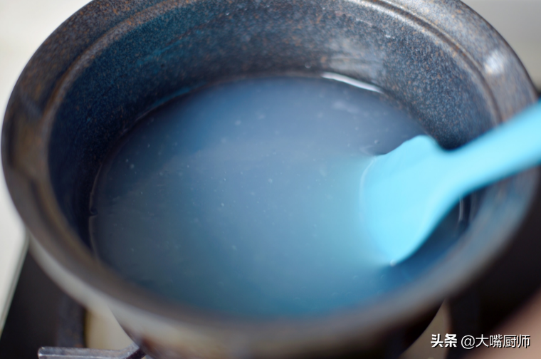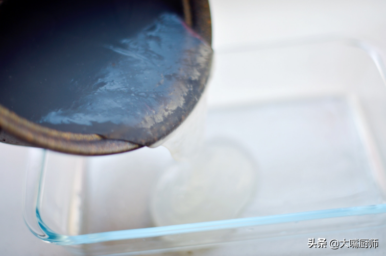 4、当锅中的淀粉糊变得十分黏稠,开始冒大泡,并且颜色非常透明时就可以关火了。准备好干净的容器,把煮好的淀粉糊倒进去,放在桌上震一震,把表面抹平,放进冰箱里冷藏2小时。
