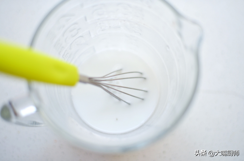 1、把100克豌豆淀粉倒入大碗中,加入2克盐、100克清水,用筷子搅拌成细腻的淀粉糊,要求无疙瘩、无干粉。