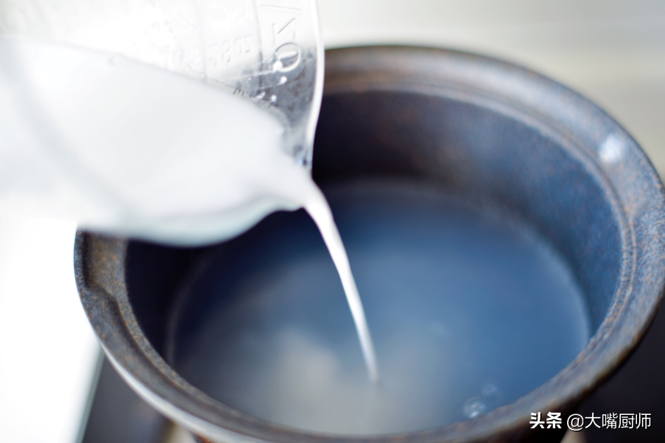 2、干净的锅子,倒入剩下的700克清水,开大火加热,不用煮开,只要锅底开始冒气泡就行了,因为豌豆淀粉的糊化温度比较低。把淀粉糊再搅拌均匀,转圈倒入锅中,边倒边用筷子搅拌,让淀粉糊和水混合均匀。