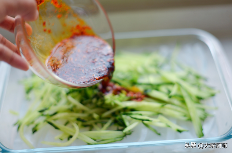 6、把凉粉放入盘中,擦一些黄瓜丝,还可以加一些油炸花生米。小碗里加入适量食盐、白糖、生抽、香醋,兑点凉开水搅拌均匀,倒入凉粉中,加入适量辣椒油,撒上蒜末、小米椒搅拌均匀即可,放进冰箱里冷藏半小时再吃,口感更好。