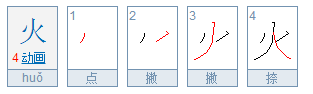 2.“火”字的笔顺是:点、撇、撇、捺。
