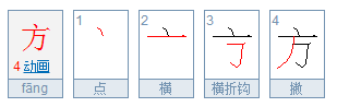 3.“方”字的笔顺是:点、横、横折钩、撇。
