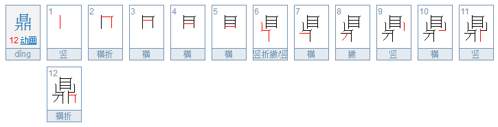 12.“鼎”字的笔顺是:竖、横折、横、横、横、竖着撇/竖、横、撇、竖、横、竖、横折。