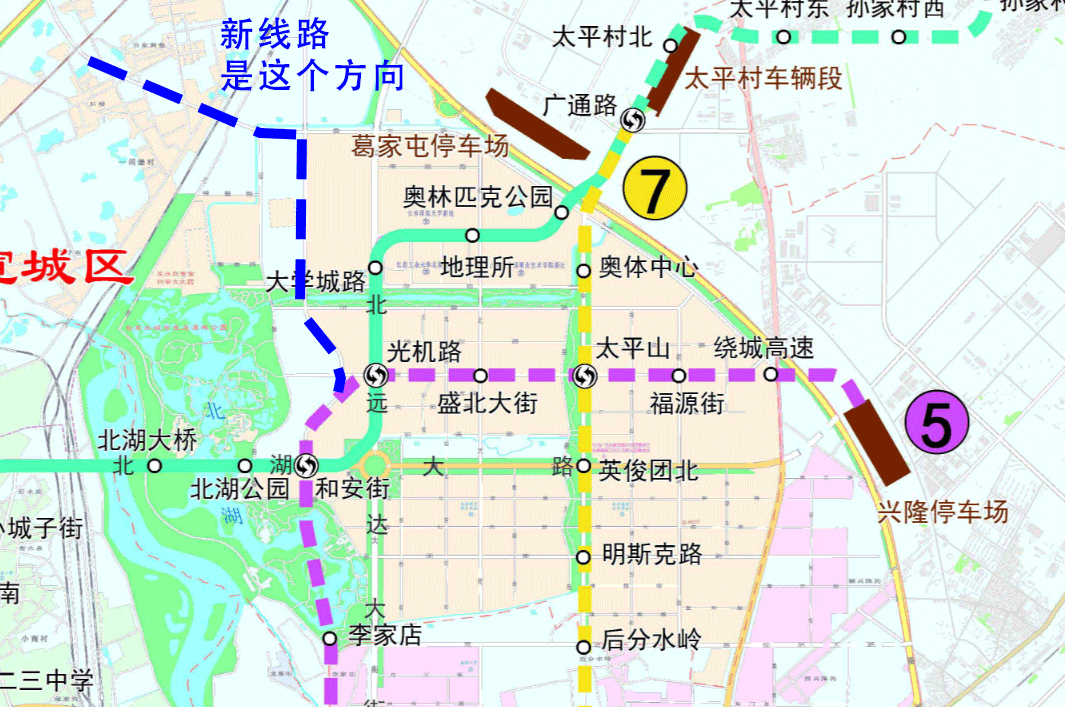 根据长春城市轨道交通现房规划图(2018版)线路显示,5、7号线北延,分别走光机路、中科大街。