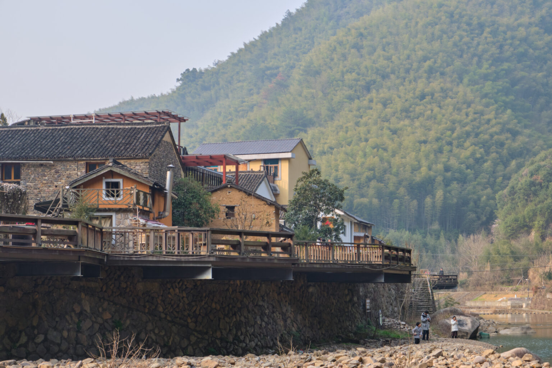 石舍村,位于桐庐县富春江镇,地处富春江镇的东南部,四面环山、三面环水,村前有月牙形弯曲的芦茨溪环村而过。俯视看整个整个山村形状像个帆船,而且石舍村距今已经有400多年的历史了,又因为村子里石头多且有特色,早年间村民都是依山伴水在石头垒砌成的屋内居住,故名石舍。