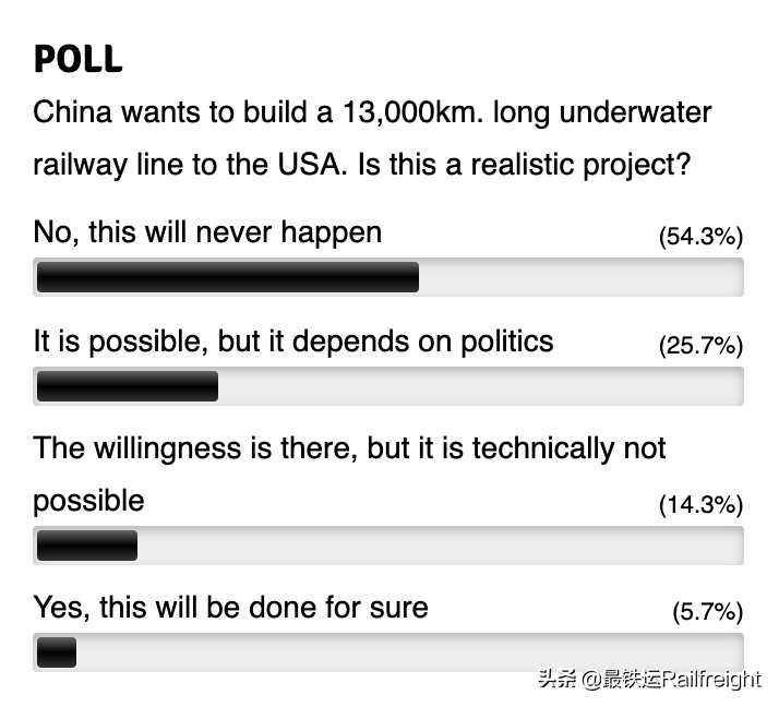 然而,大多数RailFreight的读者对该项目缺乏信心 (56%)。从技术上讲,该项目非常具有挑战性,成本也很高。此外,从国家合作层面,美国、俄罗斯和中国也许很难达成共识。更重要的是,现在还不完全清楚将有谁来建造这条隧道,因为各方似乎都有各自的野心。