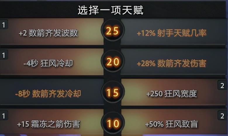我个人是不喜欢10级的时候点出天赋,所以我10级也会选择黄点,15、20级都选择数箭齐发天赋来保证输出和打钱效率,25级选择大招天赋也是为了更大化输出,而且+2数箭齐发波数的可用情况确实不多。然后在绕回来讲10级天赋,对于对方物理核多的情况,可以选择右边,而左边的天赋就是提升输出的,其实回过来再点这个天赋的时候,就判断当时的局势是否需要这50%的miss,不需要就点左边了。