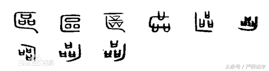 区(全部切qū、呕ōu) 区是由區简化而来,从区的古文字看应该是人们围在一起品酒的场景。“匚”指示简易的酒家草屋;“品”指示品酒。读音来自全(quan)部(bu)的切音(quan+bu),寓意只有全部品尝才可鉴别酒的质量,所以区有区分之意。读( 呕ōu拟音 )更论证了喝酒的场景,品酒多了会呕吐,后加“口”字突出呕吐的画面,呕是从口吐出。區的简化是高人所为,用“乂”来替代“品”,指人们聚在一起不能指喝酒不做事。乂是撇和捺的组合,撇“丿”指示阴,捺“㇏”指示阳,阴阳结合要适宜、要平衡,乂指治理适宜,就是现在要保持自然平衡、生态平衡,过度饮酒会损伤身体、过度开发会破坏自然环境。“绿水青山就是金山银山”。