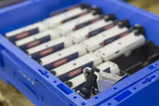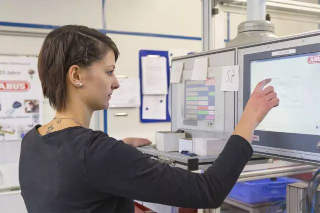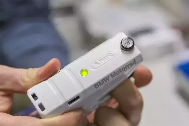 在工厂内部,我们正好看到为宝马生产的8077锁具,这款锁具在ABUS的锁具中算是比较智能的一款,锁的表面有报警灯,内部有陀螺仪监测系统,在锁闭状态下,报警灯为绿色闪烁状态,起到警示作用,而当锁有轻微的移动就会自动报警,以此对图谋不轨之人进行威慑,保证车辆安全。