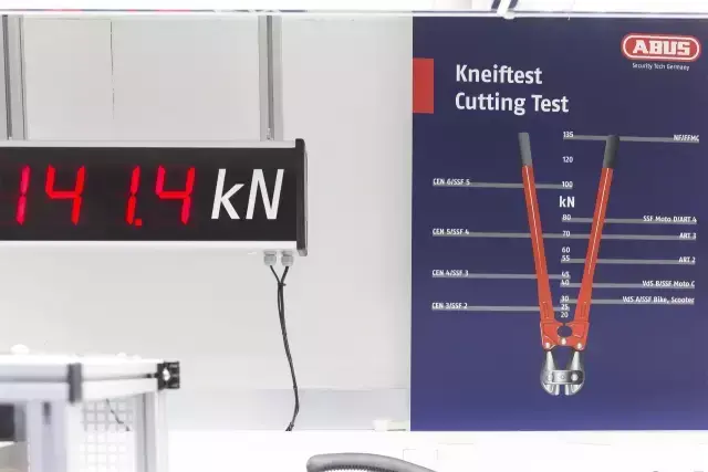 我在这里说ABUS的锁具好其实并不能说明问题,在ABUS的锁具测试实验室里,有二十多个国家的认证书,这其中各个国家的认证标准不一样,侧重的方面也不一样,但ABUS的产品都能达到他们的要求。当然,在测试实验室,真正的测试才是最有说服力的,于是,工作人员从零下40度的冰柜里拿出了一把ABUS中等级别的U型锁,这把U型锁已经在冰柜里待了24小时,拿出来之后依旧可以正常使用,而这只是开始。