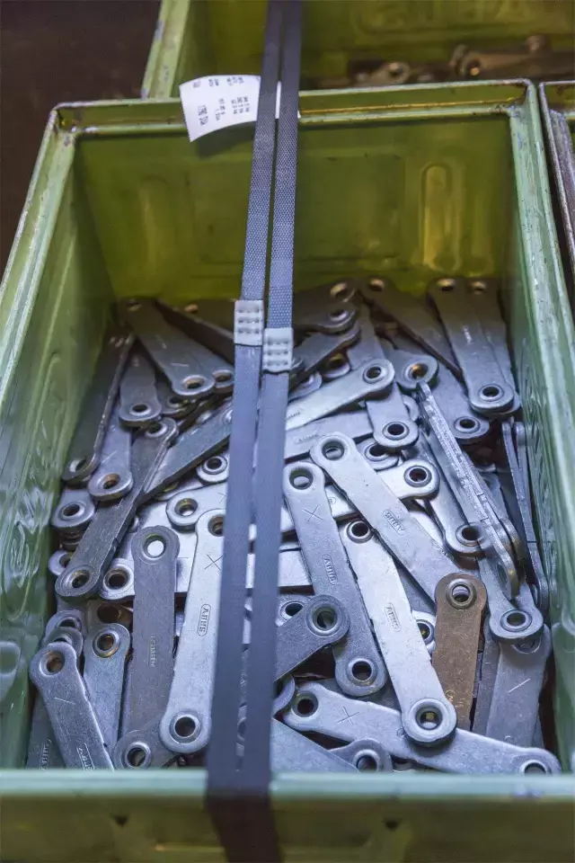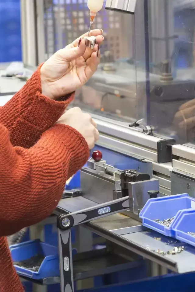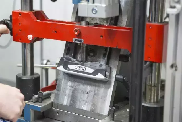ABUS折叠锁是由机器把锁组合起来,再由工人安装锁头和锁芯