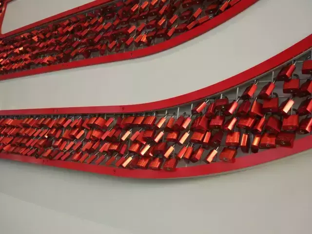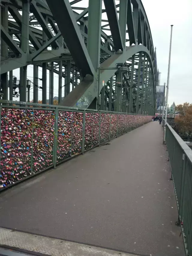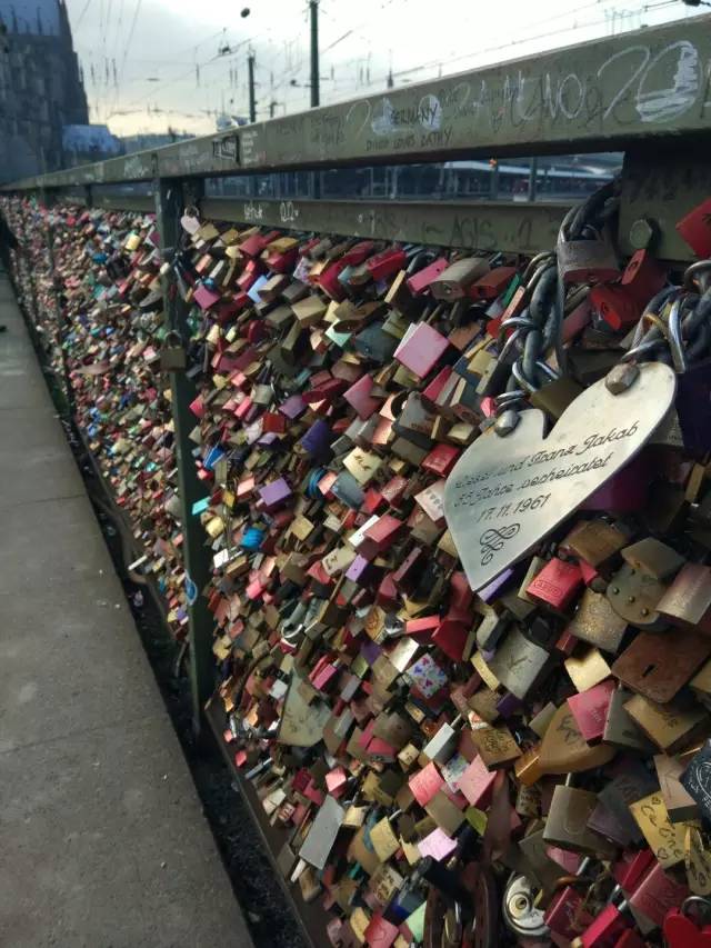好了,现在该说说情侣的事了,我确实没有骗大家,在德国的科隆,科隆大教堂的后面有一座桥,叫作霍亨索伦桥(Hohenzollernbrücke),这是一座铁路桥,两边是人行道。相传,相爱的情侣在桥上锁下一把印有两人名字的锁,并把钥匙扔到桥下的莱茵河中就能天长地久,所以在这座桥上有成千上万把爱情锁,见证的着无数恋人们的感情故事,而在所有锁中,有几乎一半的锁都是ABUS制造的,所以说ABUS的锁不紧防盗,还防分手!