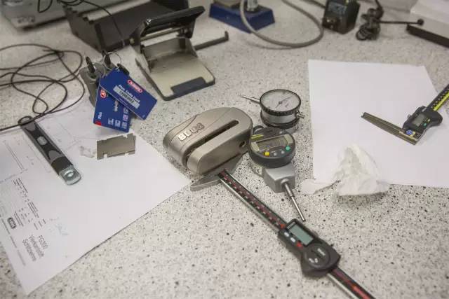 这家工厂内有两个厂房,其中一个厂房内生产的就是我们买到的ABUS摩托车锁具,另一个厂房比较神秘,我们后面再说。厂方内有专门存放原料的区域,据介绍,ABUS所用的钢材为特制钢材,比如U型锁锁柱,所用钢材表面硬度极强,中间则稍软,这是为了既保证锁的强度,同时又可以有一定的韧劲,防止扭曲破坏。工厂内部有专门的材料检测实验室,实验室内有各种仪器,全方位检验原材料是否符合标准。其中实验室内有一台强腐蚀试验机让人印象深刻,在这台机器里放一个小时,相当于在海水里放24天,而ABUS的标准是锁具要测满1000天,拿出来之后依旧能够正常使用,实在是很严酷的防腐蚀测试。