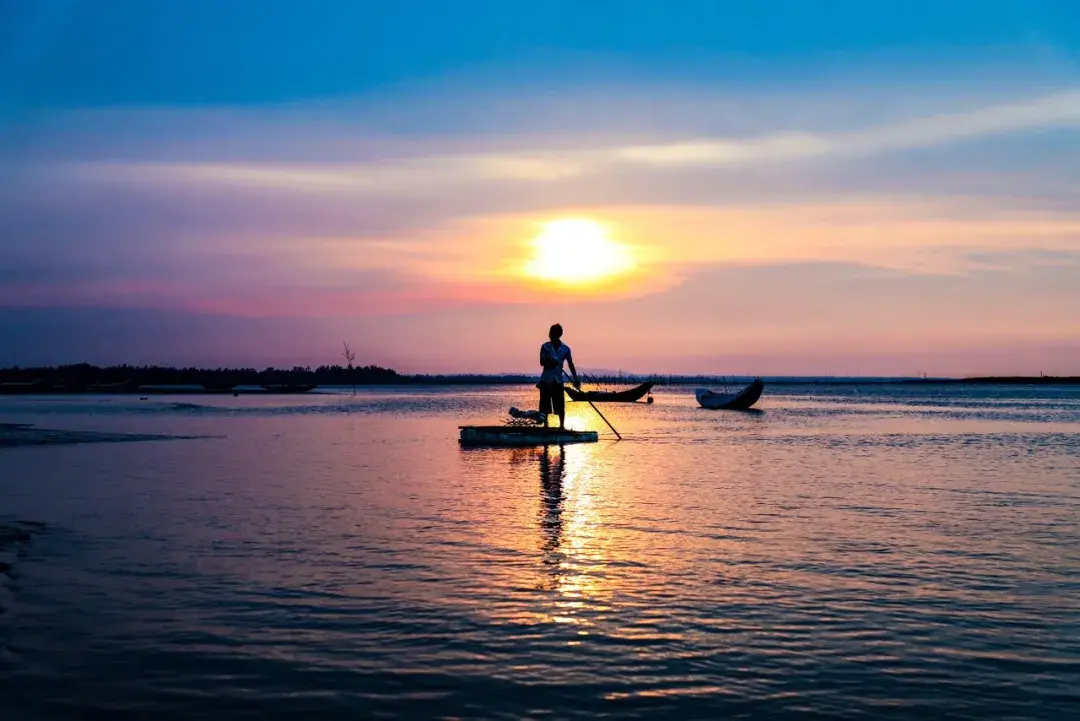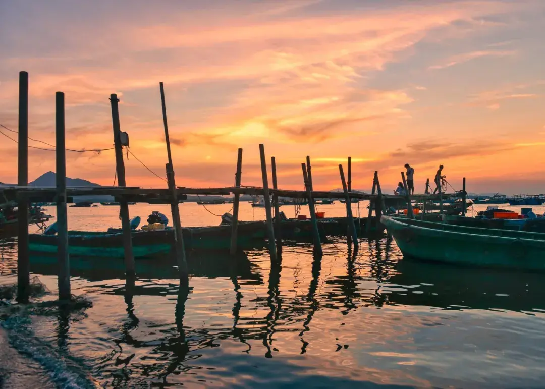 一条从马尾岛到东岛公交路线横贯海陵岛,沿线除了几处大型沙滩浴场,还有一些免费的小众景点也可造访,省钱又方便。闸坡西边的半岛 马尾岛 (马尾岛站)一带是 观看落日的好去处 。从入口处沿海边小路步行5分钟,可以到达一片开阔的浅滩,远处有礁石、渔船点缀。夕阳西下时来这边漫步戏水,悠闲惬意。从马尾岛出来沿海湾往北有 牛塘山 (闸坡养殖基地站),从石阶走上山只需10分钟左右。公交车在经过 大角湾 和 十里银滩 等一系列景点后转入海陵岛中部,这里的 山底古村 (董村站)有着与大海完全无关的田园风光。一条水泥小路穿过田野直达村口,村中有一些还算原始的青砖老房,有的爬满了藤本植物,有的开发成了客栈或茶馆,可以花15分钟在这里散散步。继续乘车,2站后的 海陵镇 (白蒲圩站)是就餐并补充体力的好地方。然后经过一段较长的距离,公交车经 敏捷黄金海岸 和 红树林 后,到达终点站东岛。