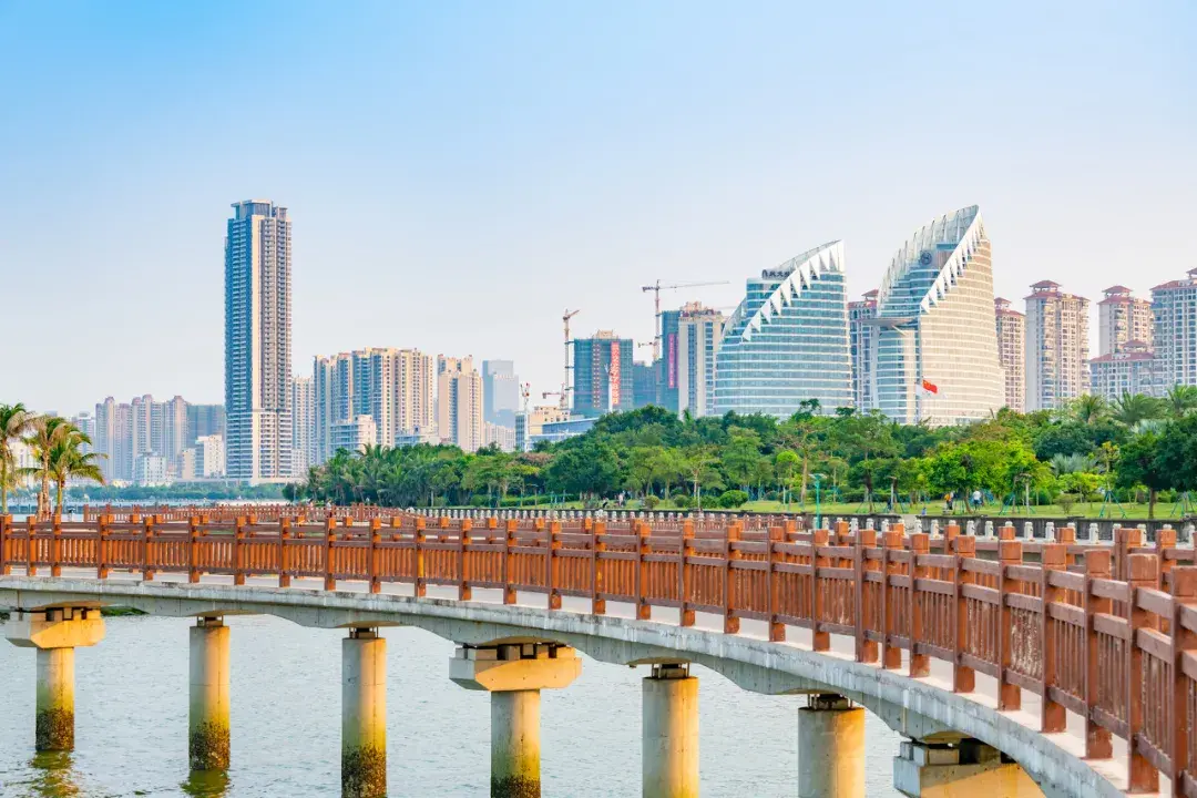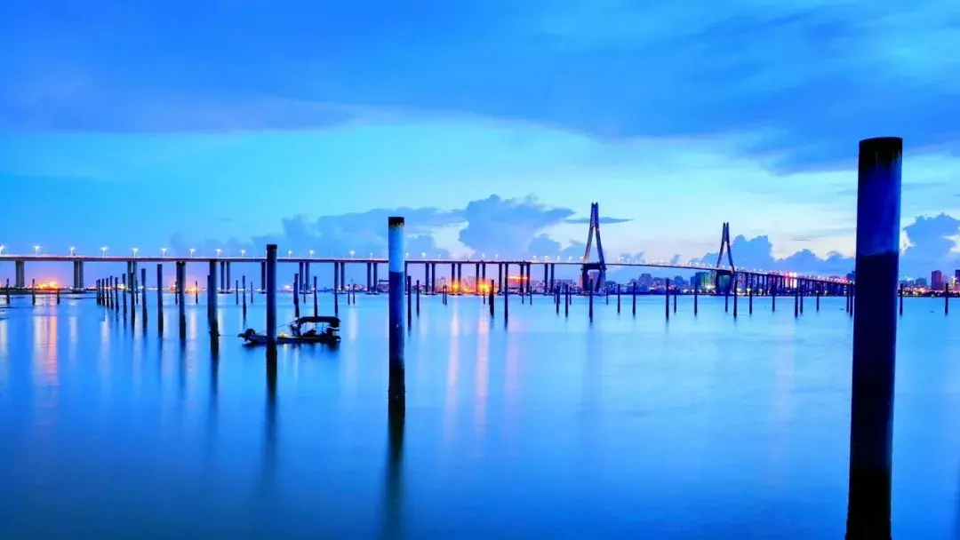 湛江是粤西 最大气、最整洁 的城市,空气指数也常年排名广东第一。花园式的滨海景观带在海岸线上绵延近5公里,直至北边椰林掩映的海滨浴场。横跨海湾的宏伟大桥指向对岸的南油基地和十里军港。一边游泳一边远眺军舰的体验,大概只在这里才有。