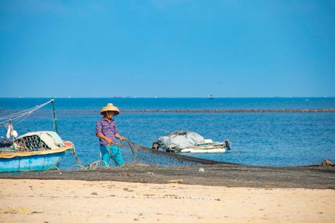 沙滩上三三两两的渔民在铺晒巨大的渔网。退潮时,一条狭长的沙洲笔直伸向大海,东边来自南海与西边来自北部湾的海浪在此交汇形成“十”字型的合水线,层层叠叠地漫延开来。从角尾乡到灯楼角的公路两旁分布着大片的晒盐场,运气好能拍到析出盐花的盐田倒映着蓝天和风车的照片。灯楼角旁边有两三家农家乐提供食宿,但都不靠海,住在这里意义不大。