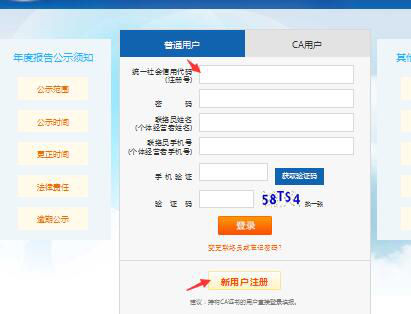 4、选择【新用户注册】,如果是个体的话开始新用户注册那出现的【企业】下拉菜单选择【个体】注册即可填报。