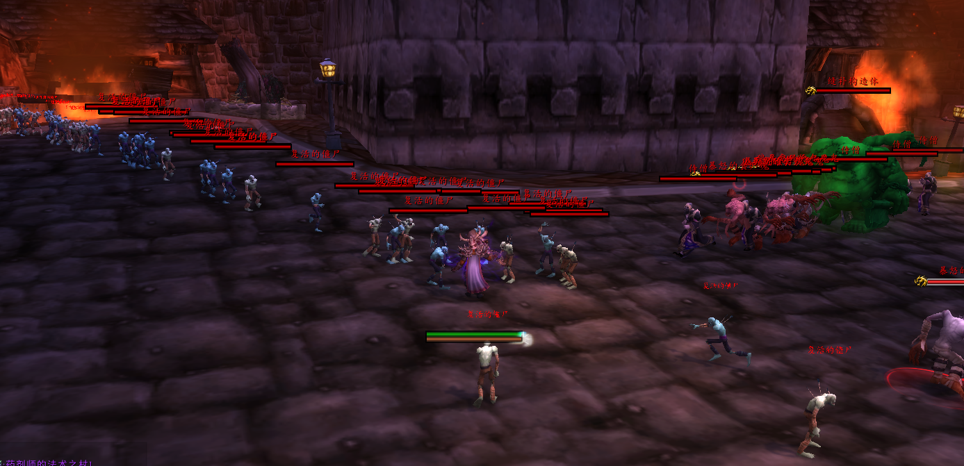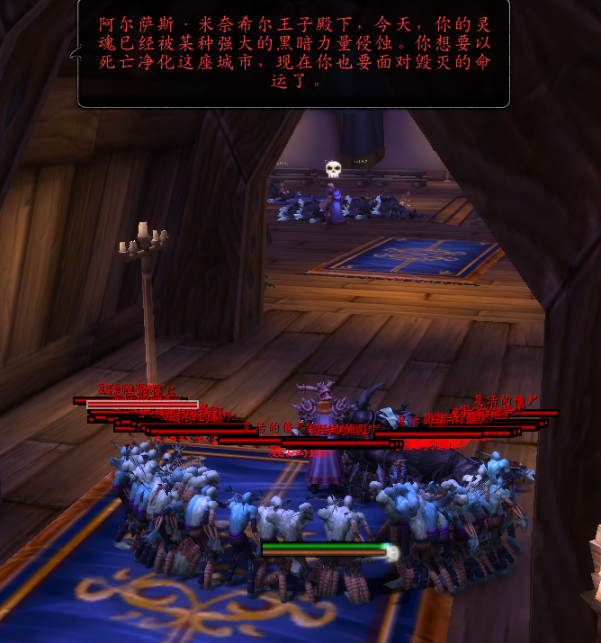 在击杀1和2号BOSS后,特意去引一些【复活的僵尸】到最国王广场那边,然后快速跑到3号BOSS的房子门口对“阿尔萨斯”对话,