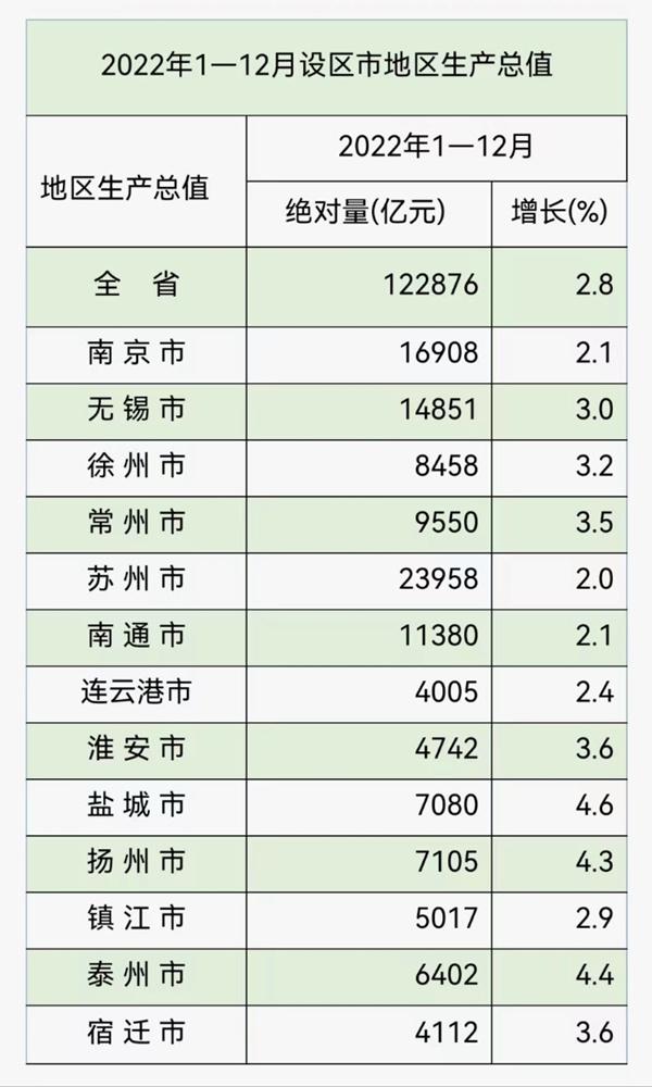江苏省统计局日前发布了2022年1-12月设区市地区生产总值(GDP)“成绩单”。数据显示,2022年,江苏全省GDP迈上12万亿大关,达122876亿元。13个设区市GDP均超4000亿元,且均保持2%及以上增长。