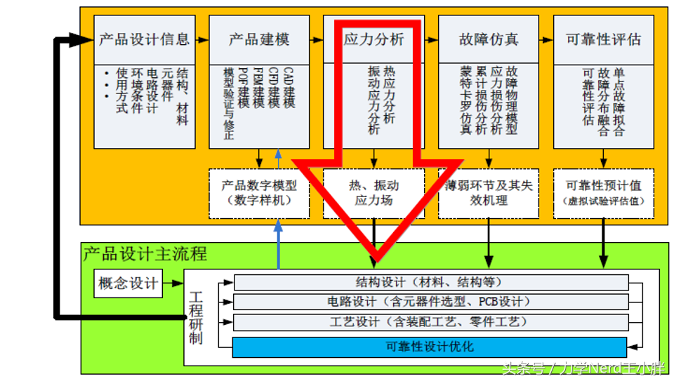 电路可靠性设计流程如上图。建模-分析-结果,三大步,根据结果给出可靠性评估。这里面,最重要的就是应力分析,即在温度载荷作用下的热应力分析。此外,还有电子产品高速旋转带来的振动分析。