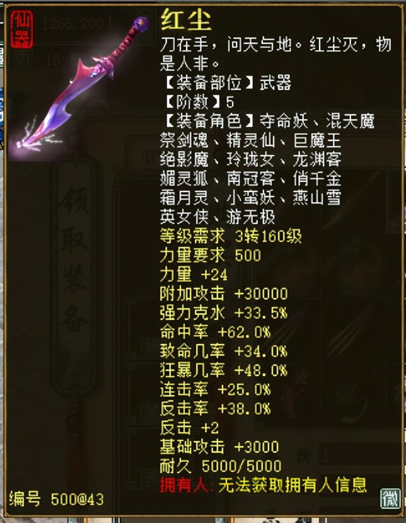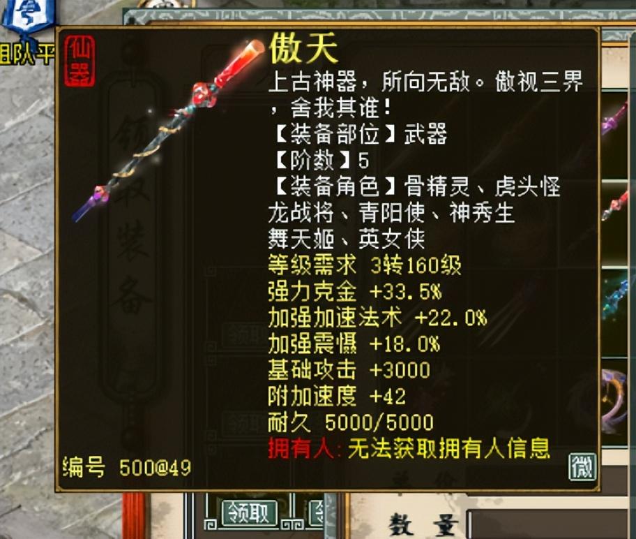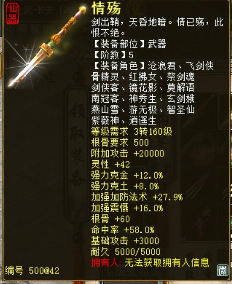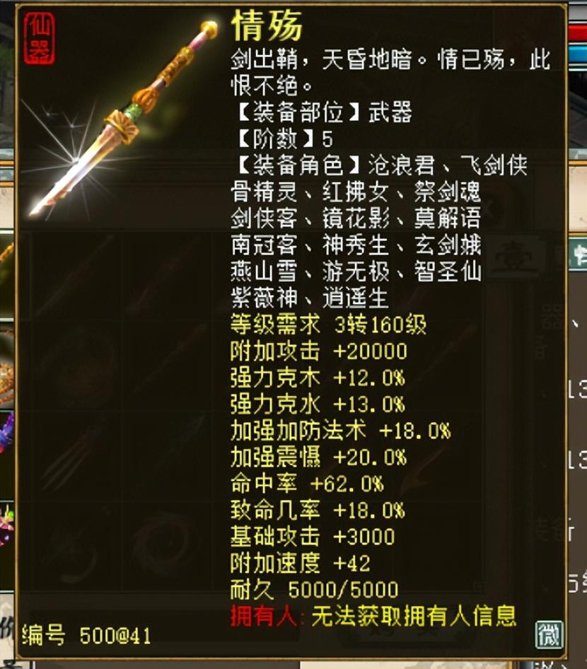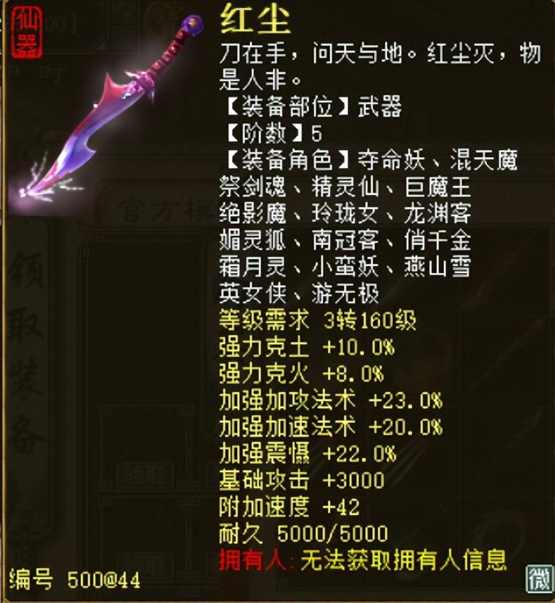 魔族的仙器,可以分为几类,一种仙器无属性要求,加强加防法术、加强震慑带附加速度,例如上图中的这件五阶情殇,这类仙器的特点是没有属性要求,适合全敏加点的女魔使用,另外这类仙器上还有强力克属性,可以做到日常、PK两不误。