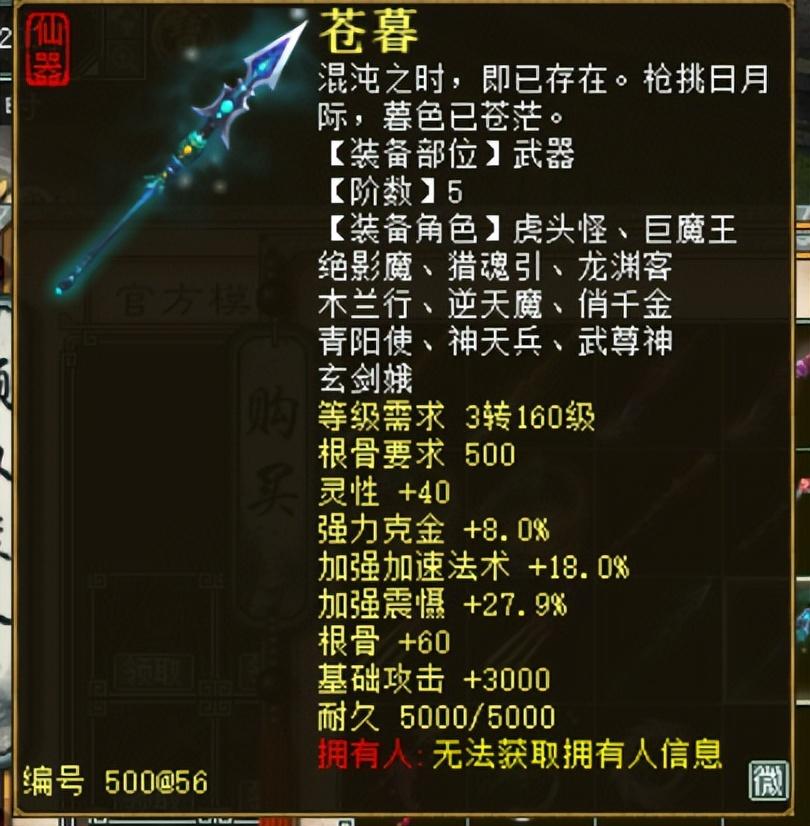 一般加强加速法术的仙器,多以无属性要求的为主,众所周知,魔族敏捷至上,除非极个别的女魔会去分配根骨点数,做盘魔,男魔的话基本都是全敏加点,但是眼前这件五阶仙器却是个例外,它居然有500的根骨要求,加强速法术和加强震慑恰好是根骨盘的翻版,这样的仙器,确实很少有魔族人士用到,加强震慑也要比普通的武器高很多,用来日常或许会不错。
