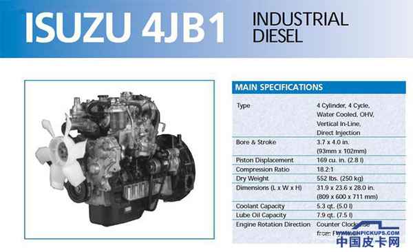 4JJ1柴油发动机,可提供最大功率130kW,最大扭矩430N•m。目前,搭载3.0T4JJ1发动机的皮卡是江西五十铃D-MAX。
