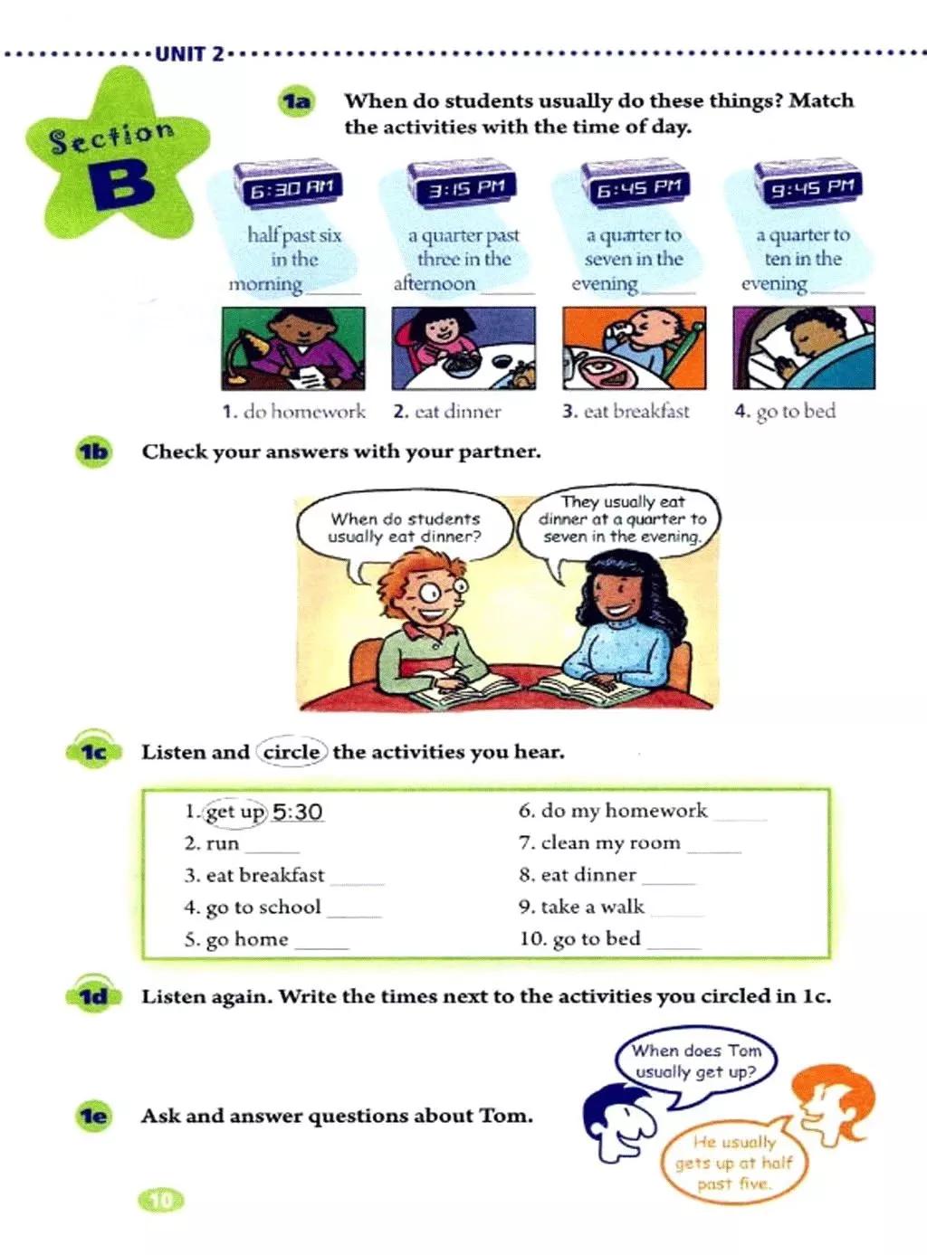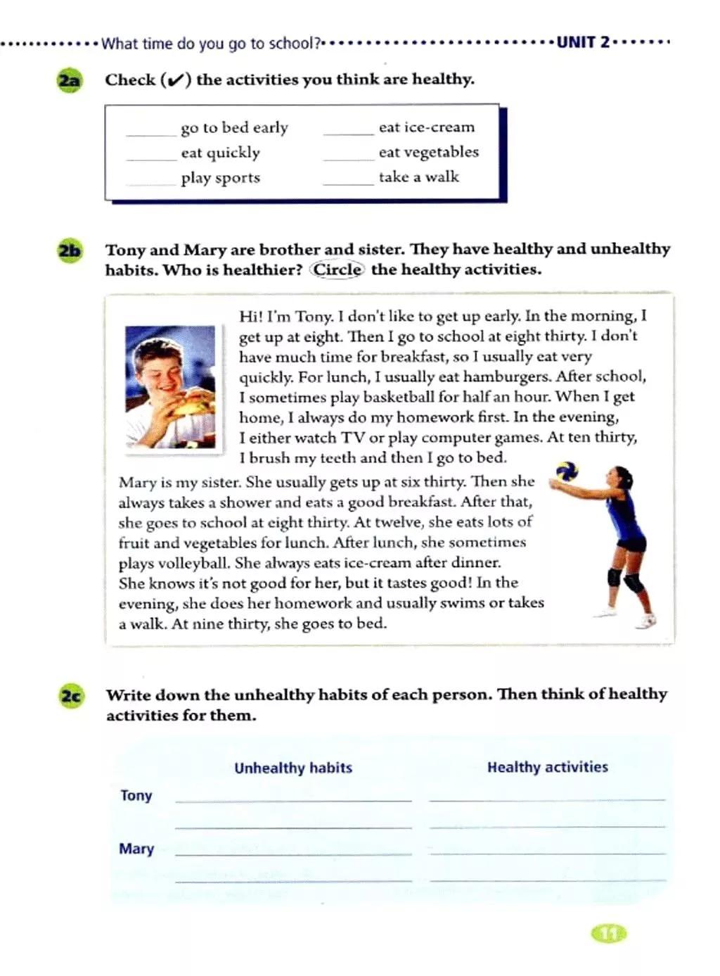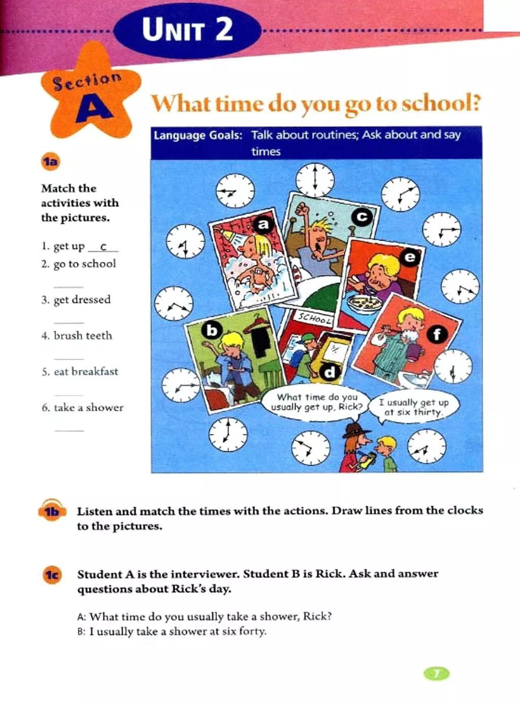 1. —What time do you usually get up? 你通常几点钟起床?—I usually get up at six thirty. 我通常6:30起床。2. That’s a funny time for breakfast. 那是个有趣的早餐时间。3. —When do students usually eat dinner? 学生们通常什么时候吃完饭?—They usually eat dinner at a quarter to seven in the evening. 他们通常在晚上6:45吃晚饭。4. In the evening, I either watch TV or play computer games.在晚上,我要么看电视,要么玩电脑游戏。5. At twelve, she eats lots of fruit and vegetables for lunch.在十二点,她午餐吃很多水果和蔬菜。6. She knows it’s not good for her, but it tastes good.她知道它对她没好处,但是尝起来很好。7. Here are your clothes. 这是你的衣服。