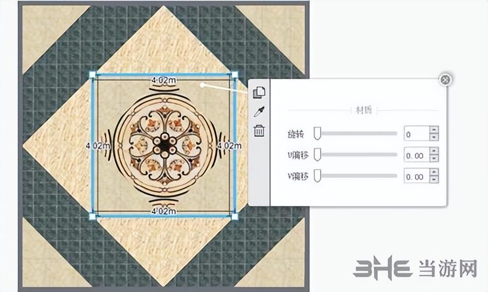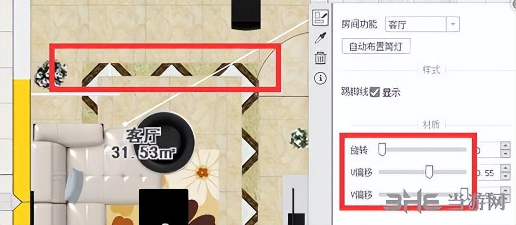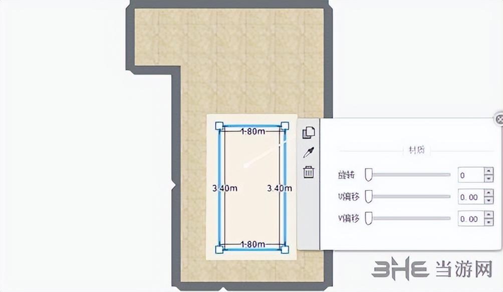 4、通过选中区域调节旋转、U偏移、V偏移来达到在区域边界展示整块砖纹的效果