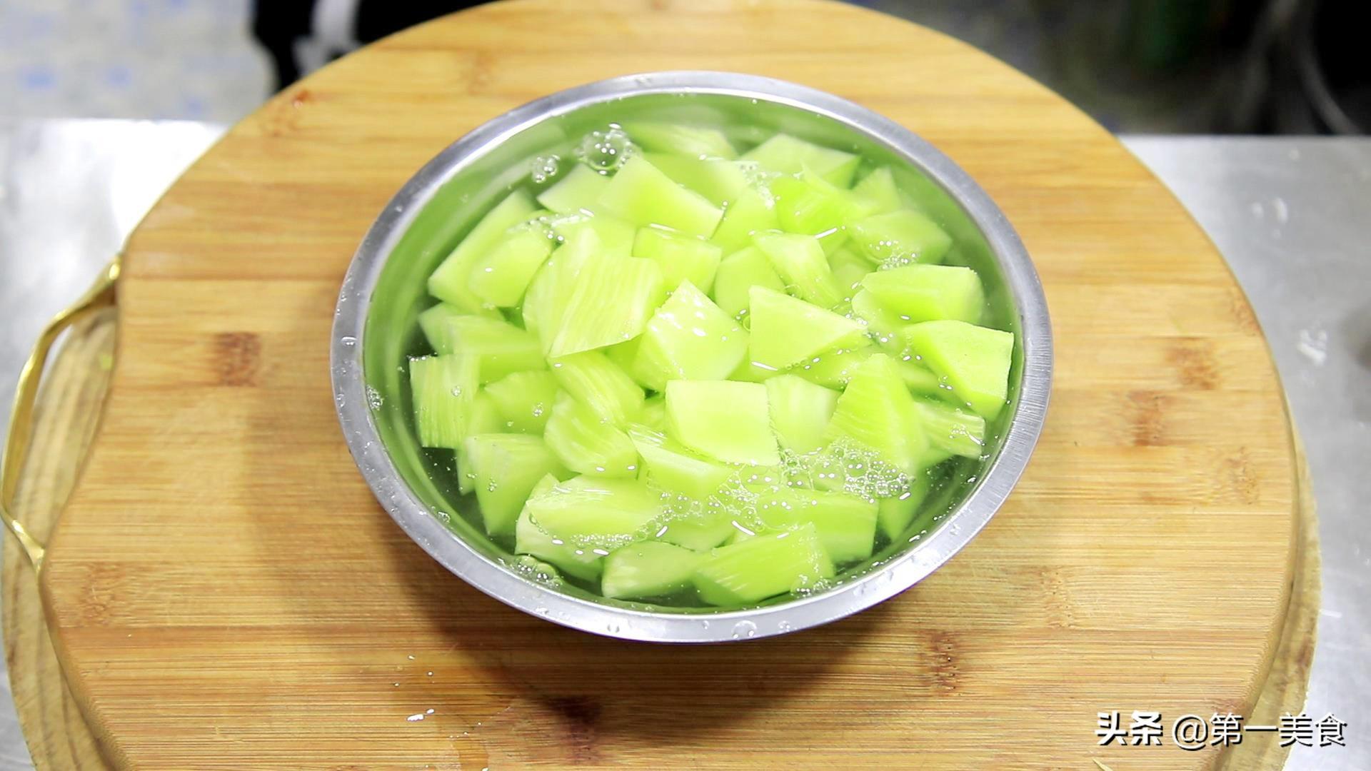 我们先把莴笋叶摘掉,把莴笋切成7厘米左右的长段,然后削净外皮。再把切段后的莴笋改刀成均匀小块,之后放入清水浸泡5分钟,这样能使莴笋的口感更加清脆。