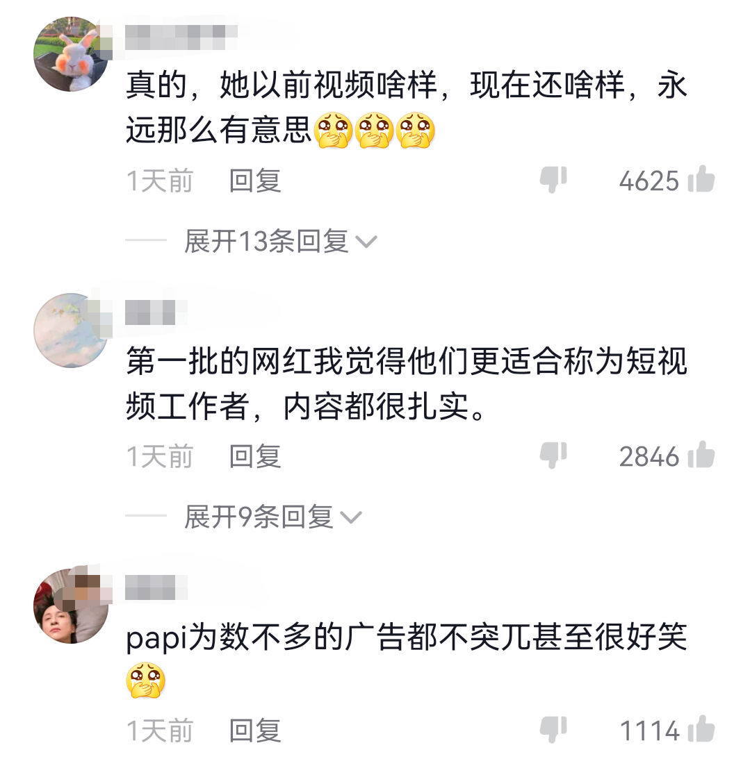 这段话引来不少网友的赞扬。不过情况真像她说的那样吗?其实papi酱这些年也试图跳脱出短视频的框架,去电影和综艺圈发展,但混了一圈还是回到了短视频中,所以才能更通透一些吧。