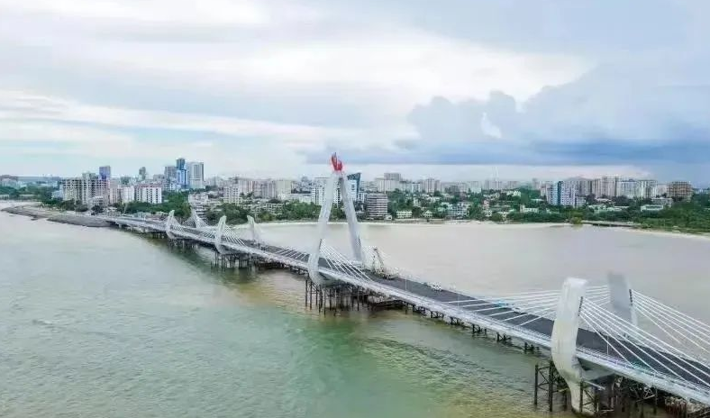 坦桑蓝跨海大桥位于达累斯萨拉姆市,横跨印度洋牡蛎湾,连接既有CBD区域与可可沙滩,为五塔斜拉桥。项目由主桥、南北引桥及双侧引道组成,大桥长1030米、双侧引道长6公里。桥面宽度20.5米,引道宽15.5米,双向4车道布置,并设置1.5米宽双侧人行道。主塔居中,两侧边塔对称排布,造型取自于坦桑尼亚国徽,中塔顶为火炬装饰造型,边塔为双手托举造型,象征自由与和平。
