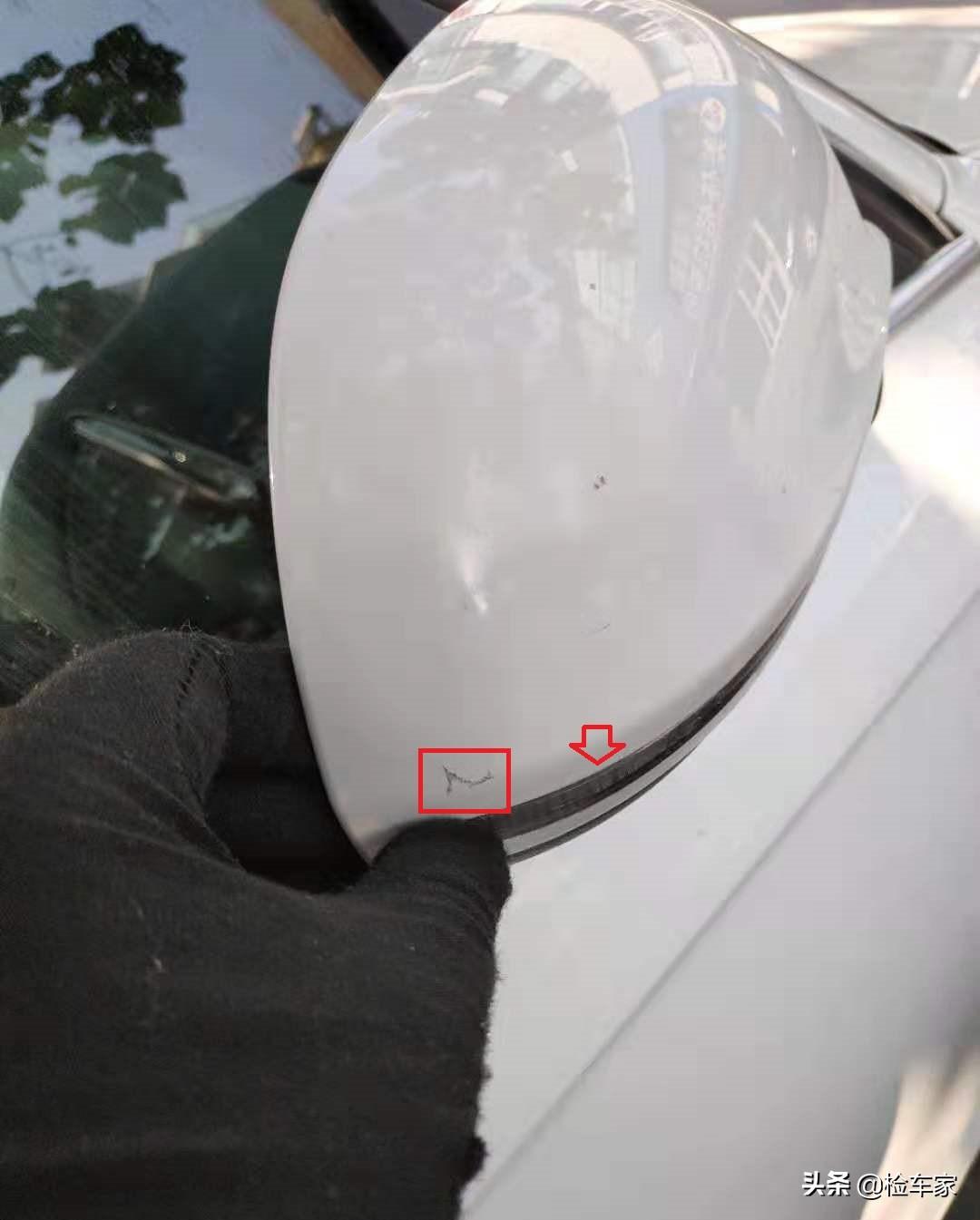 右侧后视镜缝隙内同样存在二次喷漆后残留的飞漆,且后视镜壳便表面存在明显的划痕,不是很严重,可以去修理厂找他们不用的废漆或补漆笔进行涂抹就可以搞定。