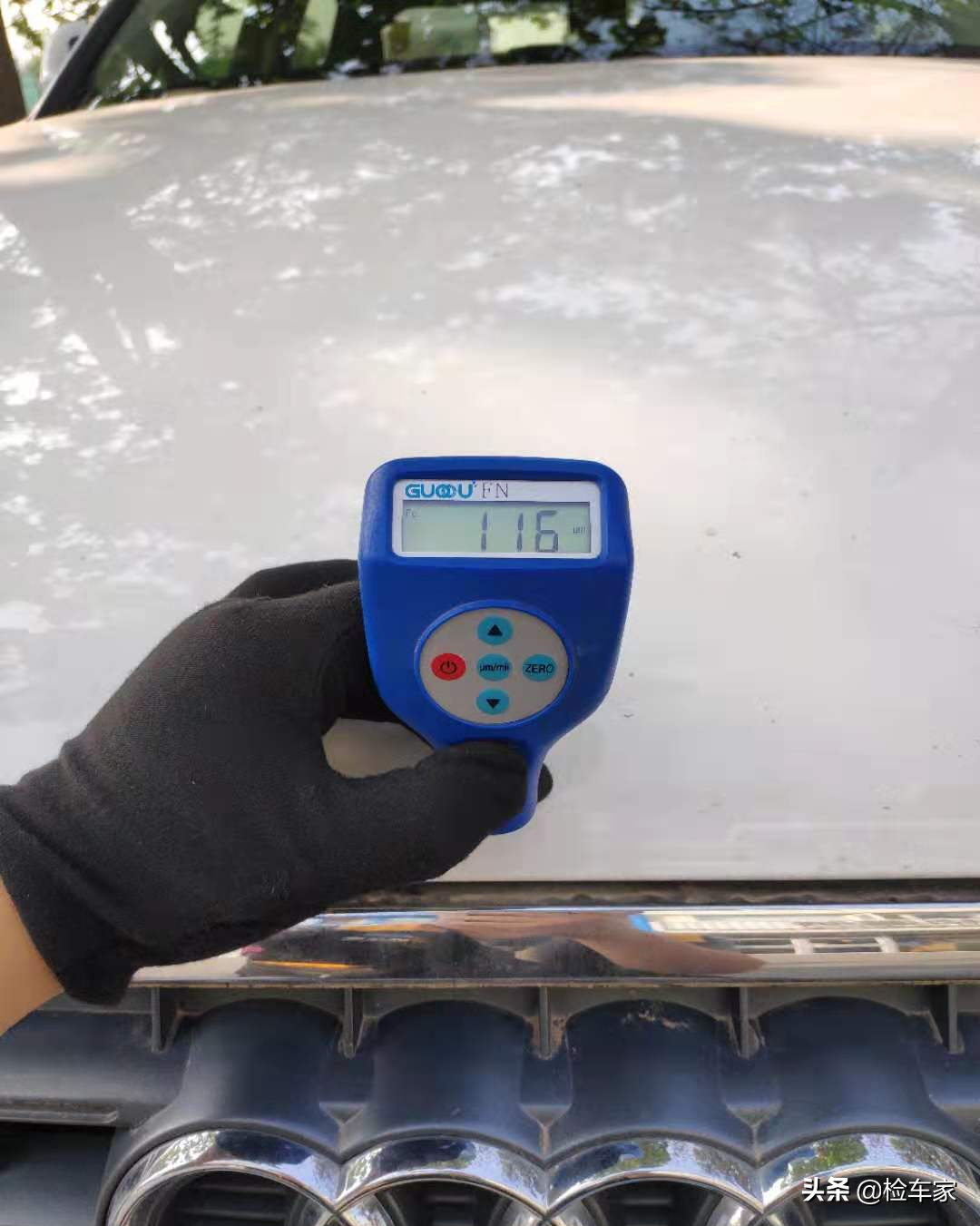 首先机盖漆面数值为116um同款车瑶瑶前期检测的也比较多,一般原车漆面数值在110um-140um左右,具体还要凭个人经验,此车机盖表面及边沿没有发现二次喷漆痕迹,两者结合可以确定机盖漆面目前为原厂也确定机盖为原厂。