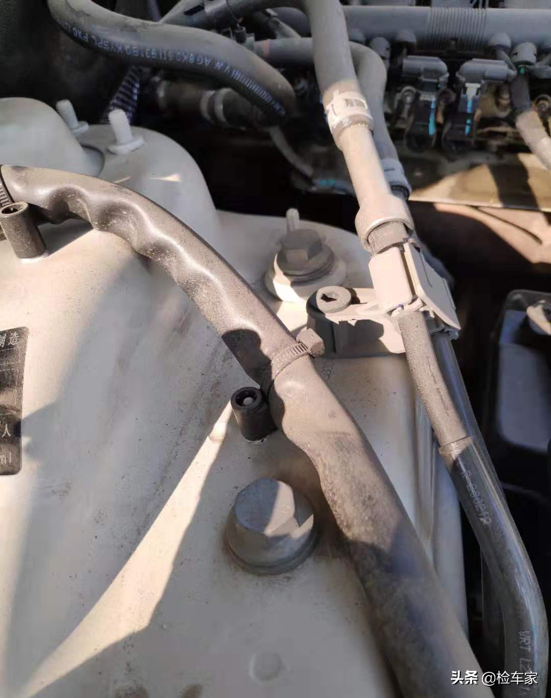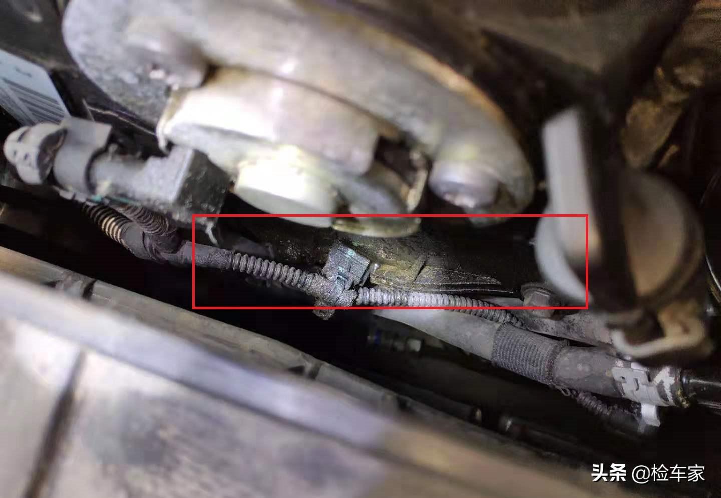 接下来就是发动机舱的检测:发动机舱内不像车商那样清洗的很干净,也可以看出现任车主对车辆发动机舱内平时关注不多,不过这样也好保留了原始的痕迹对瑶瑶的检测也带来了很大的方便~