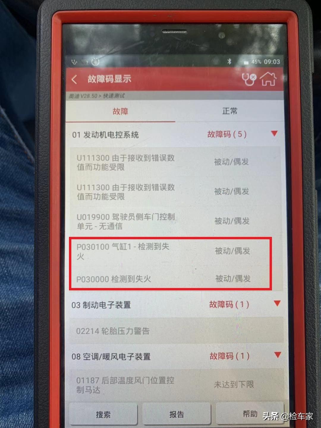 随后对车辆各传感器及电脑板进行全方位检测后结果显示存在故障码,其中最重要的一条时发动机失火(我们俗称缺缸),时上述车辆怠速抖动的主要原因,建议及时去维修点检查一缸点火线圈及火花塞。