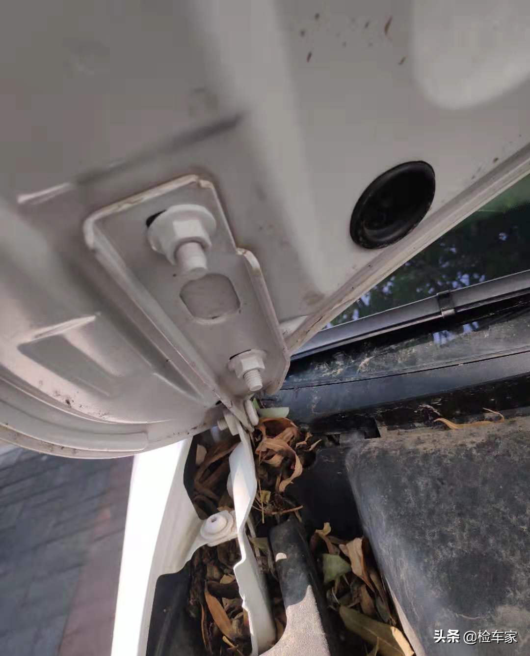 按照惯例机盖固定螺丝检测后没有发现异常拆卸拧动错位痕迹,同时机盖固定螺丝表面漆面平顺无二次喷漆后残留的飞漆及颗粒,结合对机盖外观漆面检测可以确定机盖目前为原厂,排除更换和侧面的严重撞击事故修复。不过这张图片可以看出,这台车应该是长期停放在室外的树下,所以车辆的漆面光泽会有所下降。