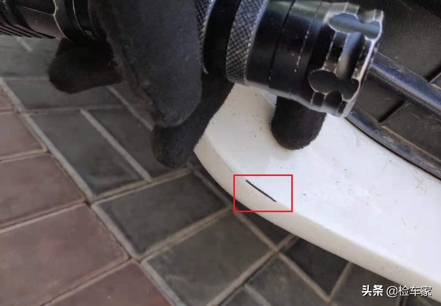 当开始对外观整体检测时发现车辆前保险杠表面存在明显划痕已经露出了底漆,且保险杠表面存在二次喷漆痕迹,漆面不是很厚,瑶瑶瞬间感觉到一股凉风!保险杠喷漆还露底漆,漆面还不是很厚,经过反复检查后发现保险杠螺丝存在拆卸且内侧存在明显新旧色差,最终可以确定车辆前保险杠更换,至于什么原因还需进一步查看。