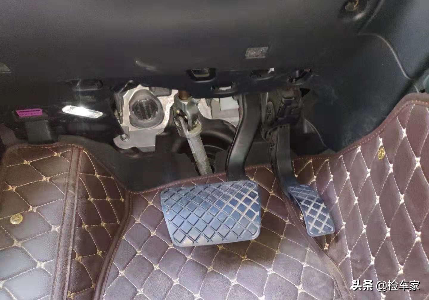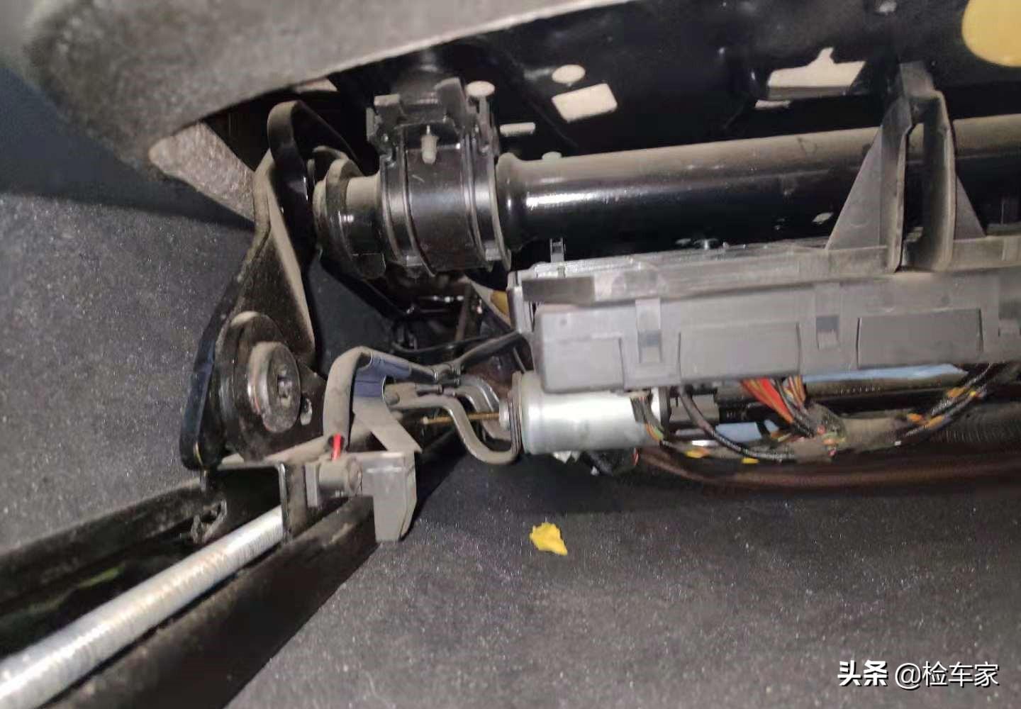 主驾驶仪表台底部转向柱及周边附件检测下来没有发现异常拆卸维修更换现象,各部件出厂日期均与车辆出厂日期相符,同时各金属部件没有异常锈蚀及打磨痕迹,底部地胶比较干燥,没有发现异常泥沙及发霉痕迹,综合检测可以确定转向柱及周边附件目前为原厂。