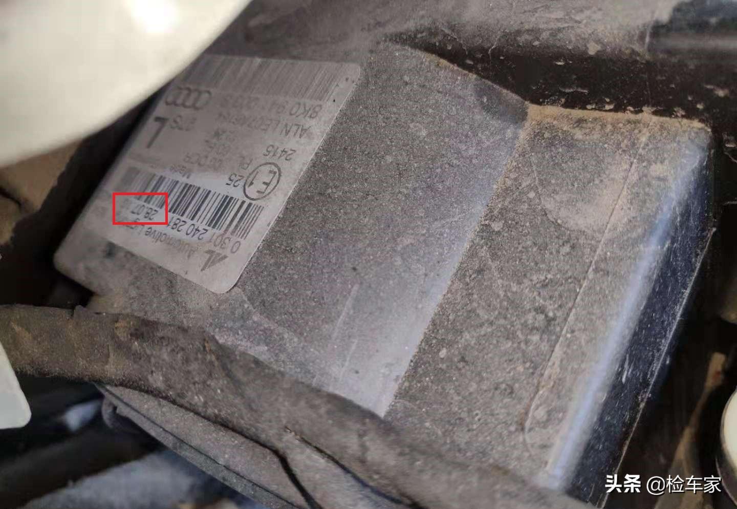 经检测发现车辆左前大灯螺丝存在拆卸痕迹且左前大灯出厂日期为2016年07月28号,而车辆总装出厂日期为2010年12月,左前大灯的出厂日期比车辆总装出厂日期晚7年,不用过多解释,确定左前大灯更换。