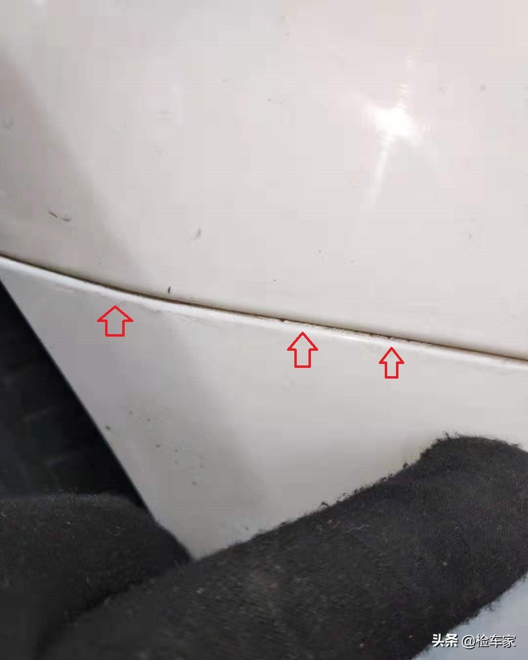 车辆后保险杠缝隙内也存在二次喷漆后的残留,保险杠表面还存在明显流漆,估计当时喷漆的应该是个学徒工;但保险杠固定螺丝并无拆卸拧动错位痕迹,保险杠内侧新旧程度和车龄相比比较相符,可以确定后保险杠为原厂,应该是刮蹭划痕导致的二次喷漆,可以排除车身尾部的撞击事故。