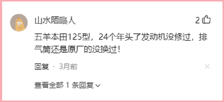 网友表示:自己的五羊本田125型,24年发动机没有修过,排气筒没有换过。下面我们来了解这位摩友的五羊本田品牌。